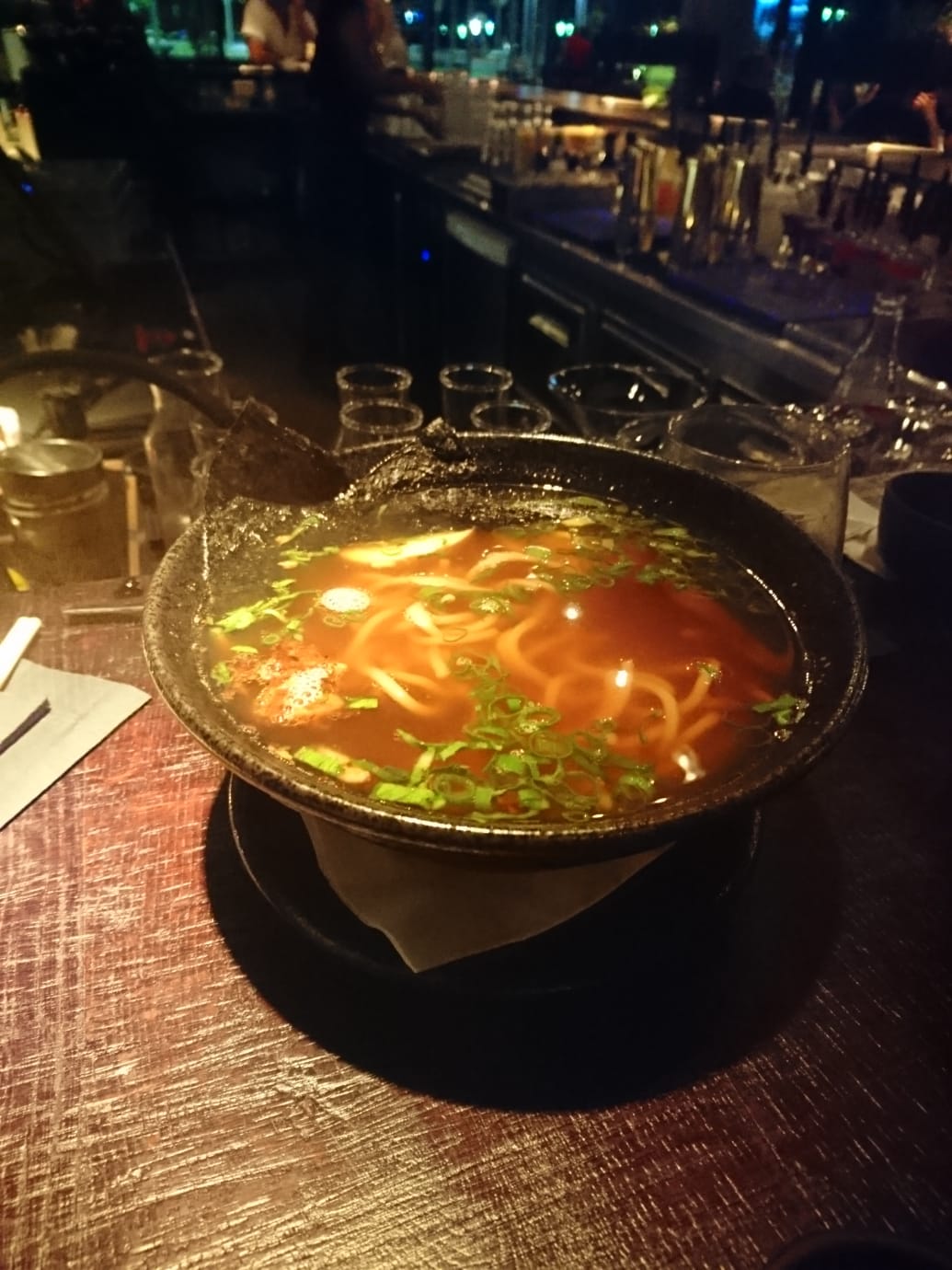אנחנו שואלים את הברמן מה להזמין. דבר ראשון, הסקס אפיל נוטף מכל הברמנים. לפחות ממי ששירת אותנו. בכל מקרה, ברגע אמירת המילה "ראמן" ליבי מחסיר פעימה. קול בתקול בוקע מלמעלה ואומר אולי, אולי הגעת למקום הנכון? נראה. אנחנו מזמינים ראמן, פורטובלו באן, סושי מיוחד ושני קוקטיילים מפוצצים וקינוח מיוחד להפליא. דבר ראשון, הקוקטיילים. כל צעד של הברמן, אפשר לשמוע את צליל הקראק! של שבירת לב נוסף. הדיוק בפרטים, מעל הגימיקים ופעלולים, היא מדהימה. מקצוענות זה שם המשחק. משמע, זה המקום לנסות בו דברים. שניהם, "הפרפל דרגון" והפוג'י פלאוור נותנים לך רק טוב כמו בעיטות ברוס לי אך ברכות מדהימה. הראשון, הבנוי מסלק, תפוח עץ, חליפיניו ביטרס, אגבה אל חימדור רפסודו וג' ינג'ר מעושן בשבבי עץ תפוח. כן כן. מה שקראתם. פיצוץ. נתן את המכה ועוד קצת. מעודן אך נותן תחושה של שילוב מעניין ורלוונטי. בהחלט בר ציון בציון. האחר נחמד. נותן טעימה מרומזת למזרח. מורכב מסאקה ניגורי השלג, המושלם, קאווה, אפרול אבטיח וליים בניחוח תה ירוק. מי אמר יפני ולא קיבל? מעולה. כבר רוצה להגיע ליפן. האמת, מעניין מה היה קורה אם הייתי מבקש היי-בול